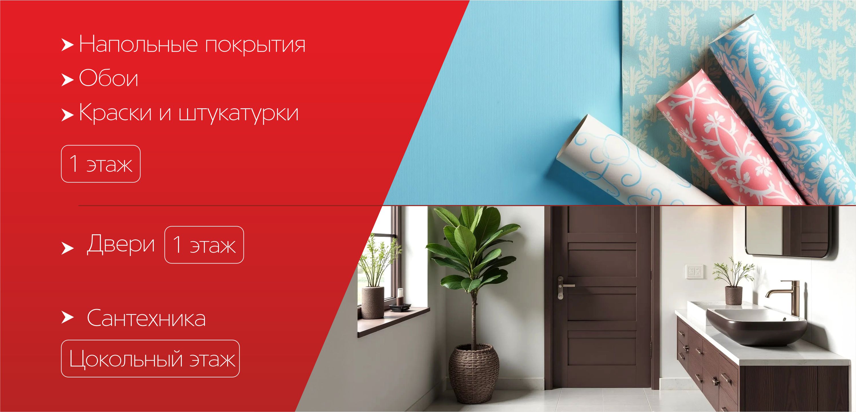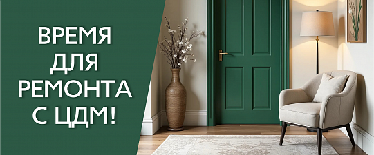 Широкий ассортимент товаров для ремонта и отделки: напольные покрытия, обои, краски, декоративные штукатурки. Входные и межкомнатные двери.