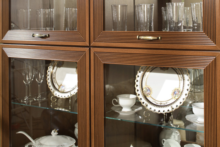 На задних стенках шкафов со стеклянными вставками есть зеркала. Это помогает зрительно расширить комнату.