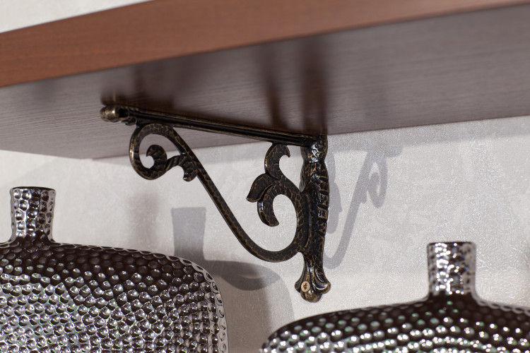 Полка АГ-025.03 навешивается на стену на декоративных менсолодержателях (МакМарт);