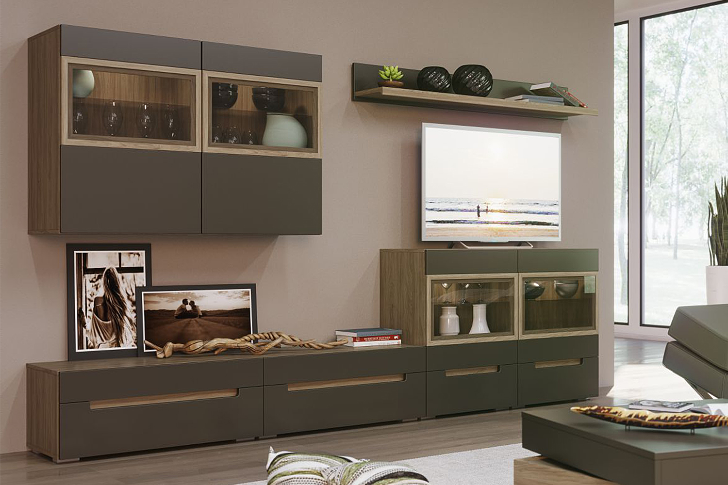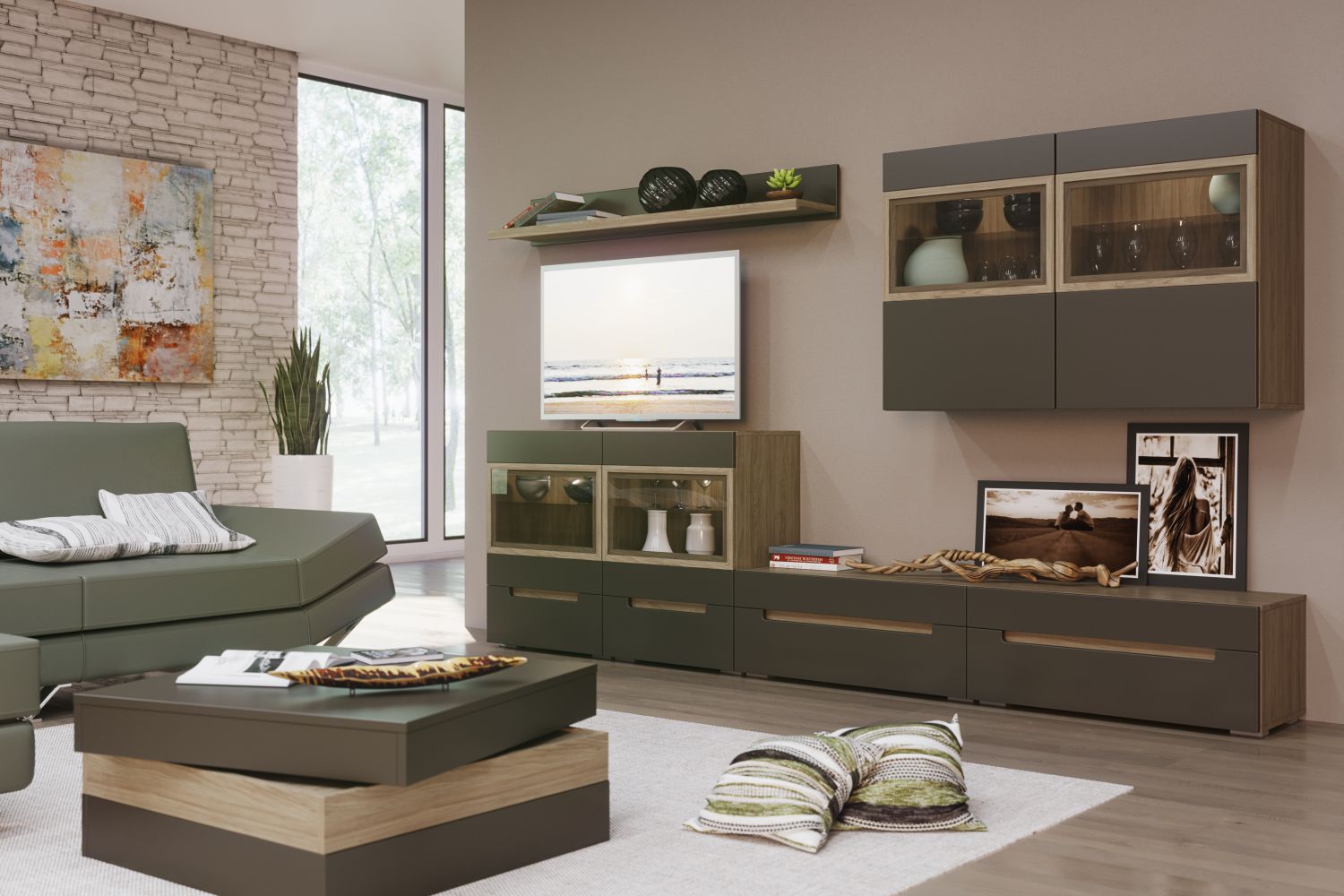 Гостиная в современном стиле. Такая мебель универсальна и подойдет интерьерам в стилях эко, минимализм и лофт (в его более «легком» варианте). Кроме того, вы можете создать темную вариацию скандинавского стиля, если светлые оттенки вам не очень нравятся или уже надоели;