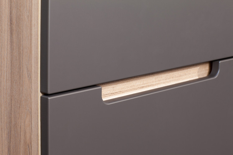 Корпус мебели выполнен в цвете «швейцарский вяз», фасады — в цвете «серый матовый»;