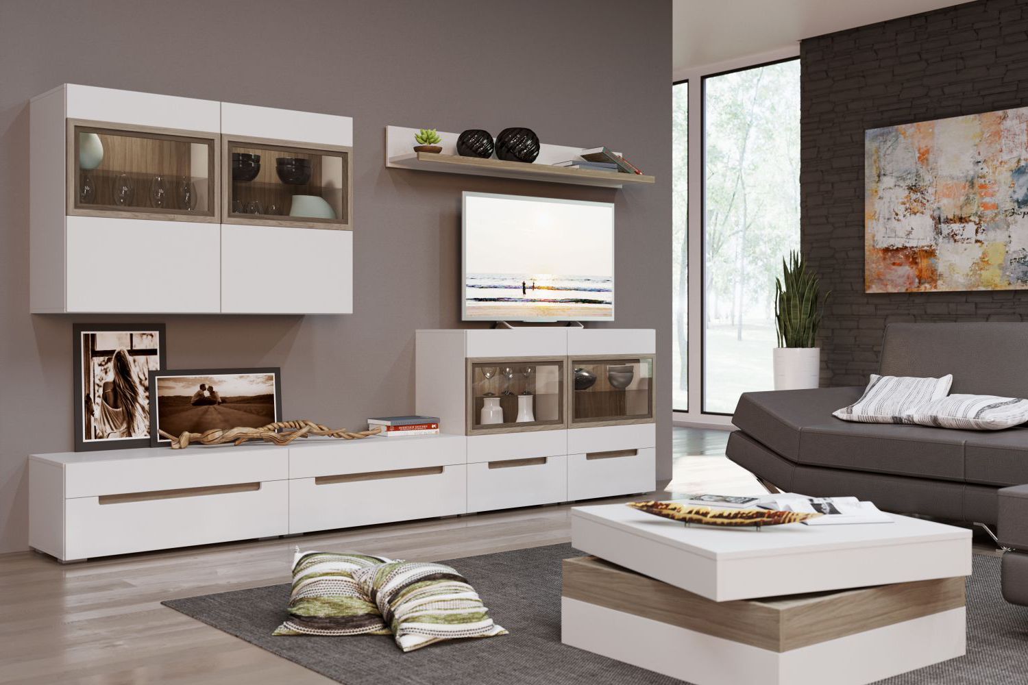 Гостиная в современном стиле. Такая мебель универсальна и подойдет интерьерам в стилях эко, скандинавский, минимализм и лофт (в его более «легком» варианте);
