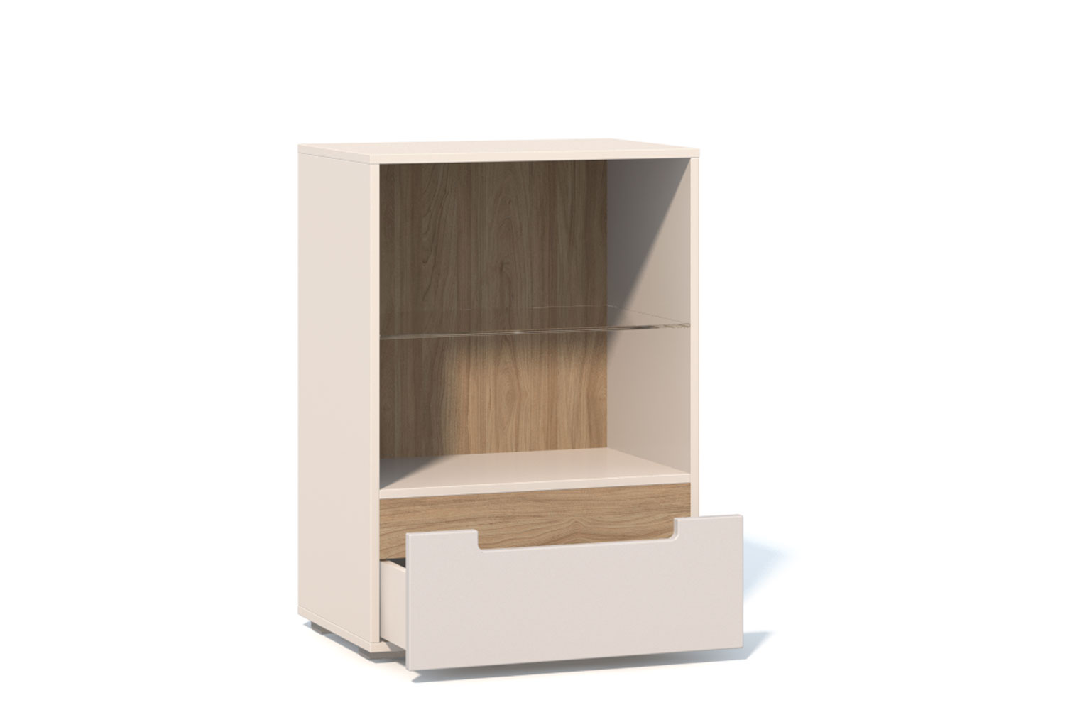 Корпус и фасады мебели выполнены в белом цвете, ручки — в цвете «швейцарский вяз»;