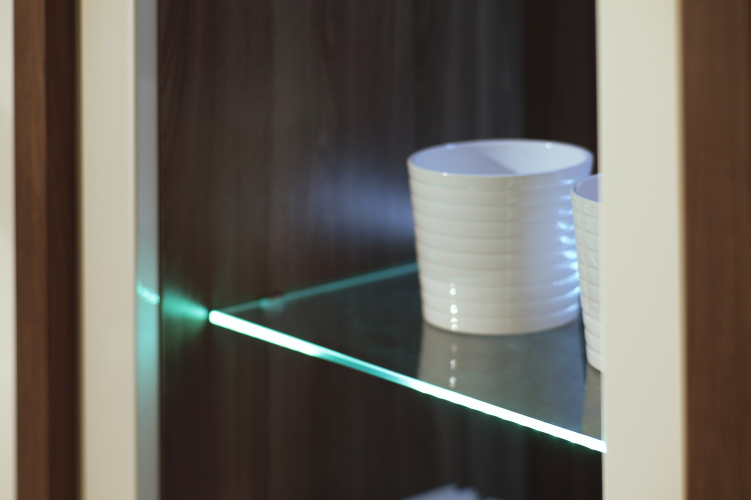 Уникальное стекло StopSol на фасаде одного из шкафов легко скроет содержимое и при необходимости подчеркнет наполнение шкафа подсветкой (отличный вариант для коллекционеров, которые хотят ненавязчиво показать свои «сокровища»).