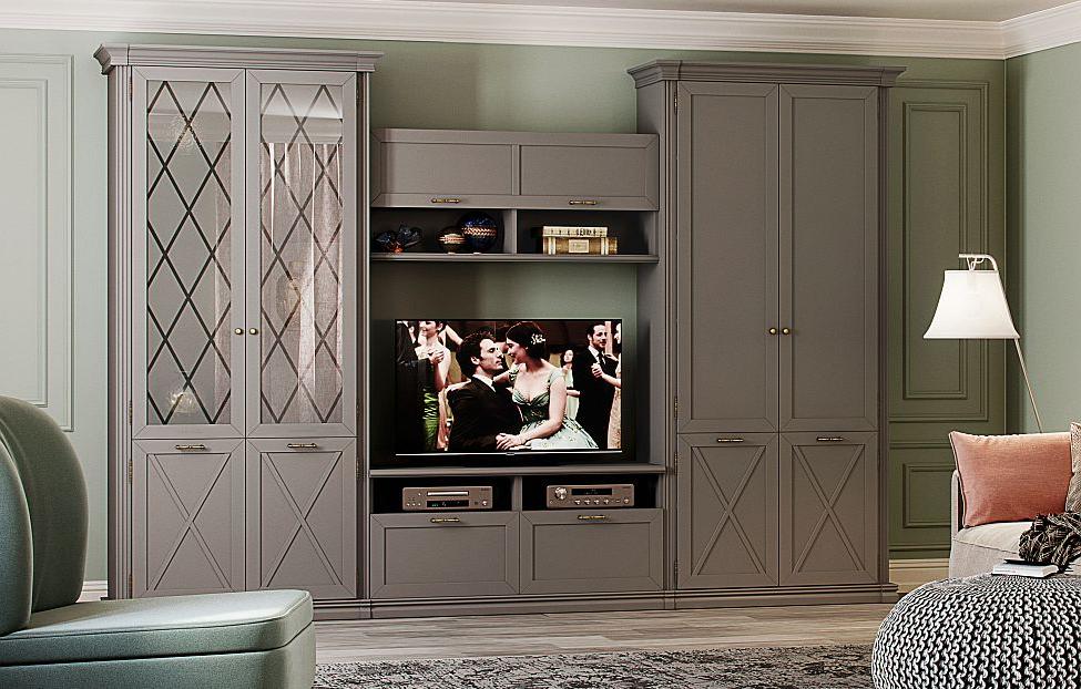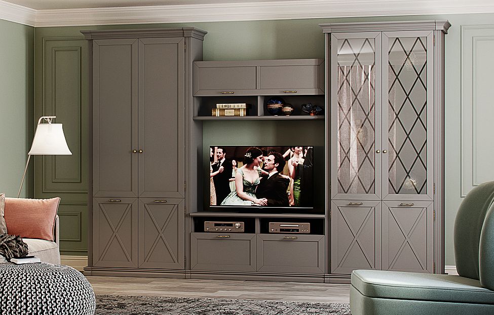 С этой мебелью будут хорошо сочетаться аксессуары в стиле неоклассика, ковры с винтажным потертым рисунком, светлый прямой или угловой диван. Конечно же, не забудьте про журнальный столик, яркие постеры и кресло на высоких ножках, чтобы сделать вечерние кинопосиделки еще приятнее.