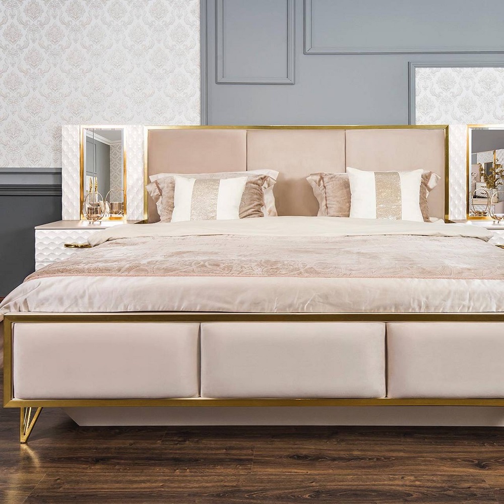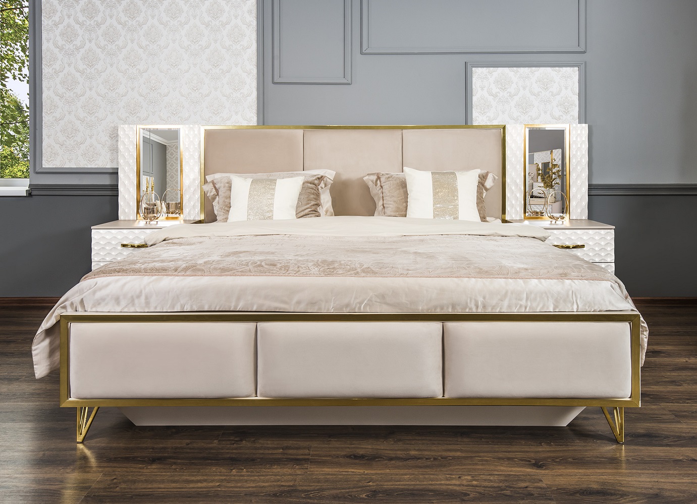 Кровать с декоративными рамками на изголовье и изножье под латунь– делает ее центром притяжения! Ведь кровать в спальне главный элемент мебели!