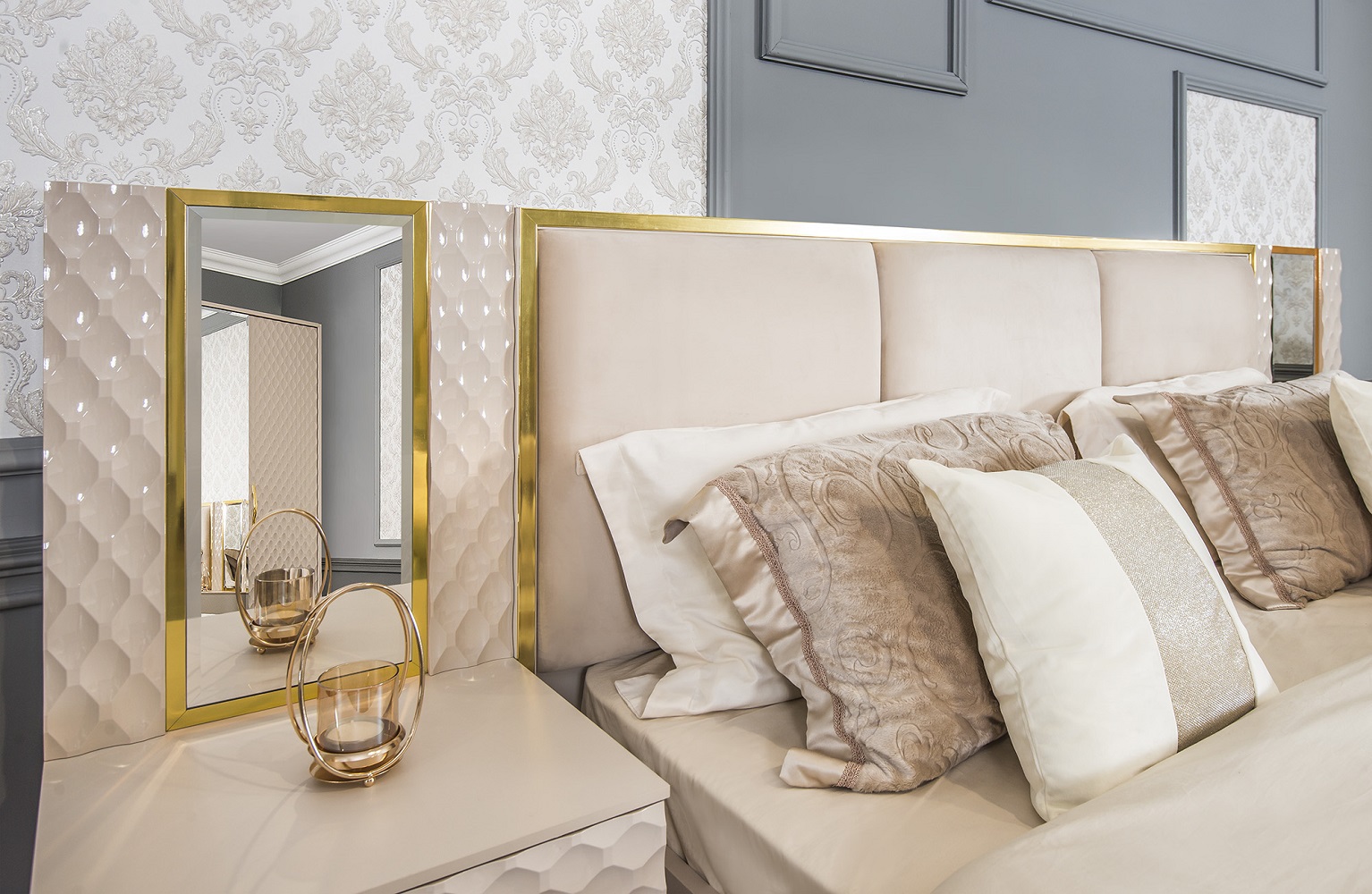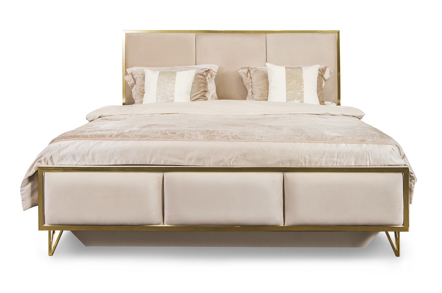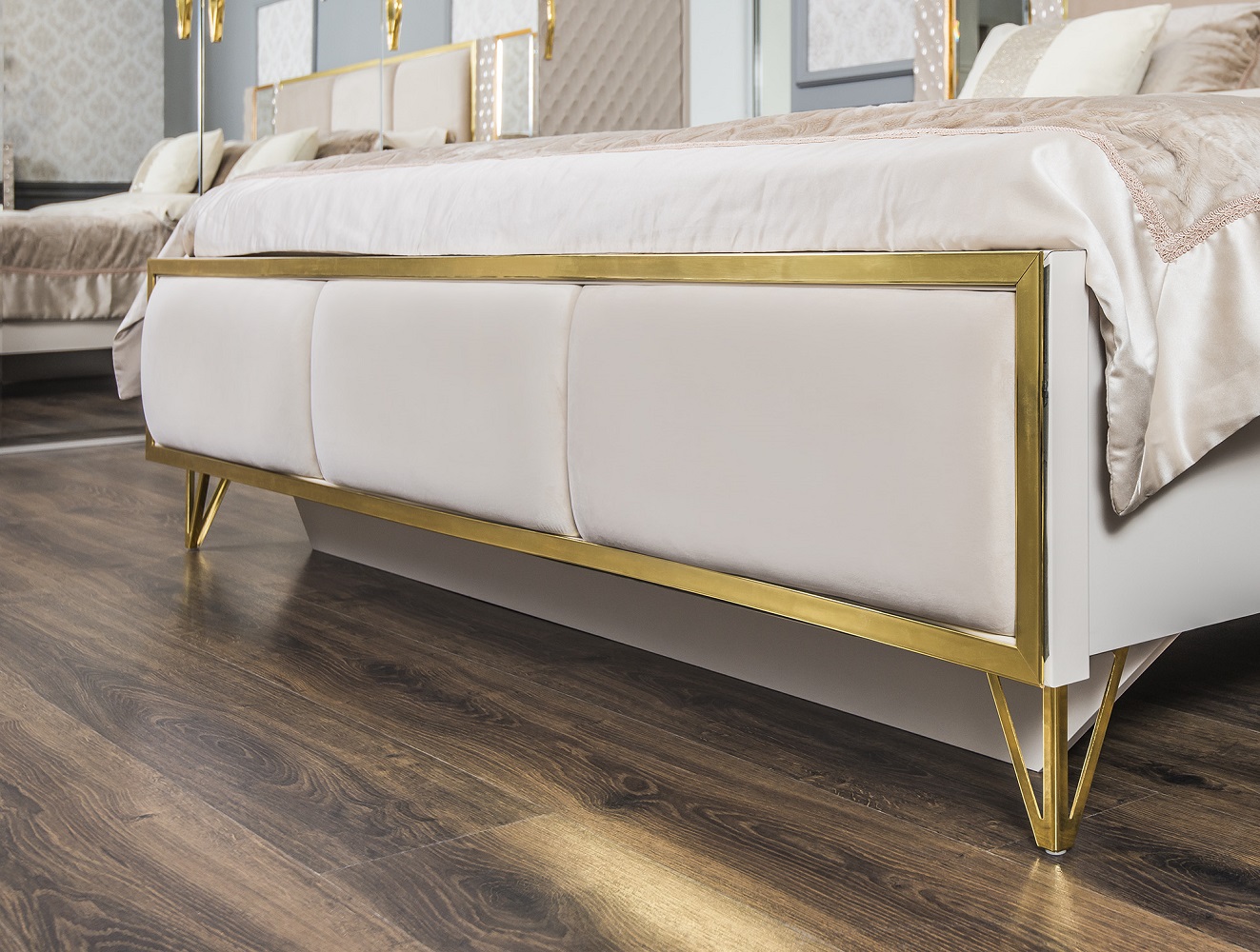 Кровать с декоративными рамками на изголовье и изножье под латунь– делает ее центром притяжения! Ведь кровать в спальне главный элемент мебели!