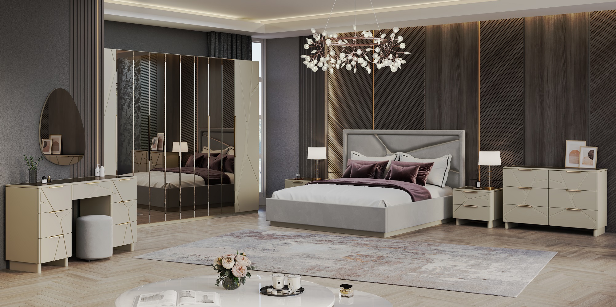 Каждая деталь спальни тщательно продумана, чтобы подарить вам не только максимальный комфорт и эстетическое удовольствие, но и уверенность в высоком качестве мебели. Корпуса и столешницы модулей выполнены из ламинированной древесной плиты европейского качества, Фасады из природного МДФ задекорированы рельефной фрезеровкой и авторский стиль фабрики ЭРА — это финишное покрытие матовая итальянская эмаль ярко серого цвета.