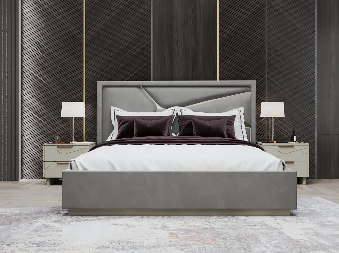 Доминантой интерьера спальни является мягкая кровать Стелла Оригинальная простежка и строгий лаконичный силуэт поддерживают общую стилистику, а форма изголовья с изогнутыми краями образуют уютное пространство для спокойного и крепкого сна