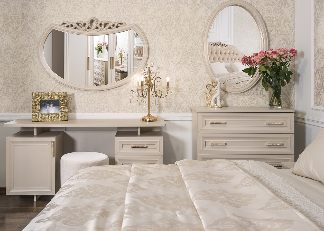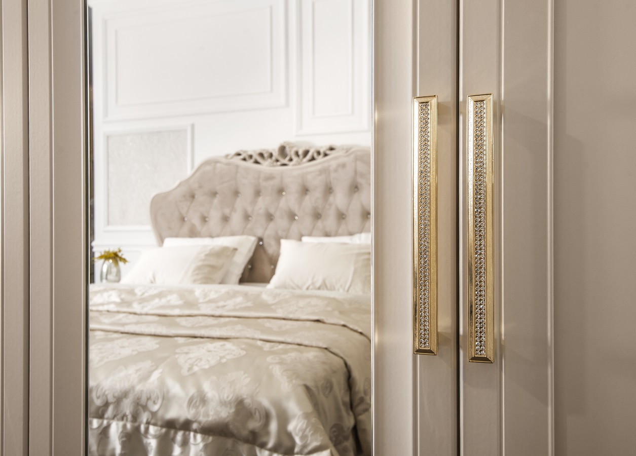 Гладкая поверхность, декор на стеклах и латунные ручки со стразами, в которых переливаются лучи света.