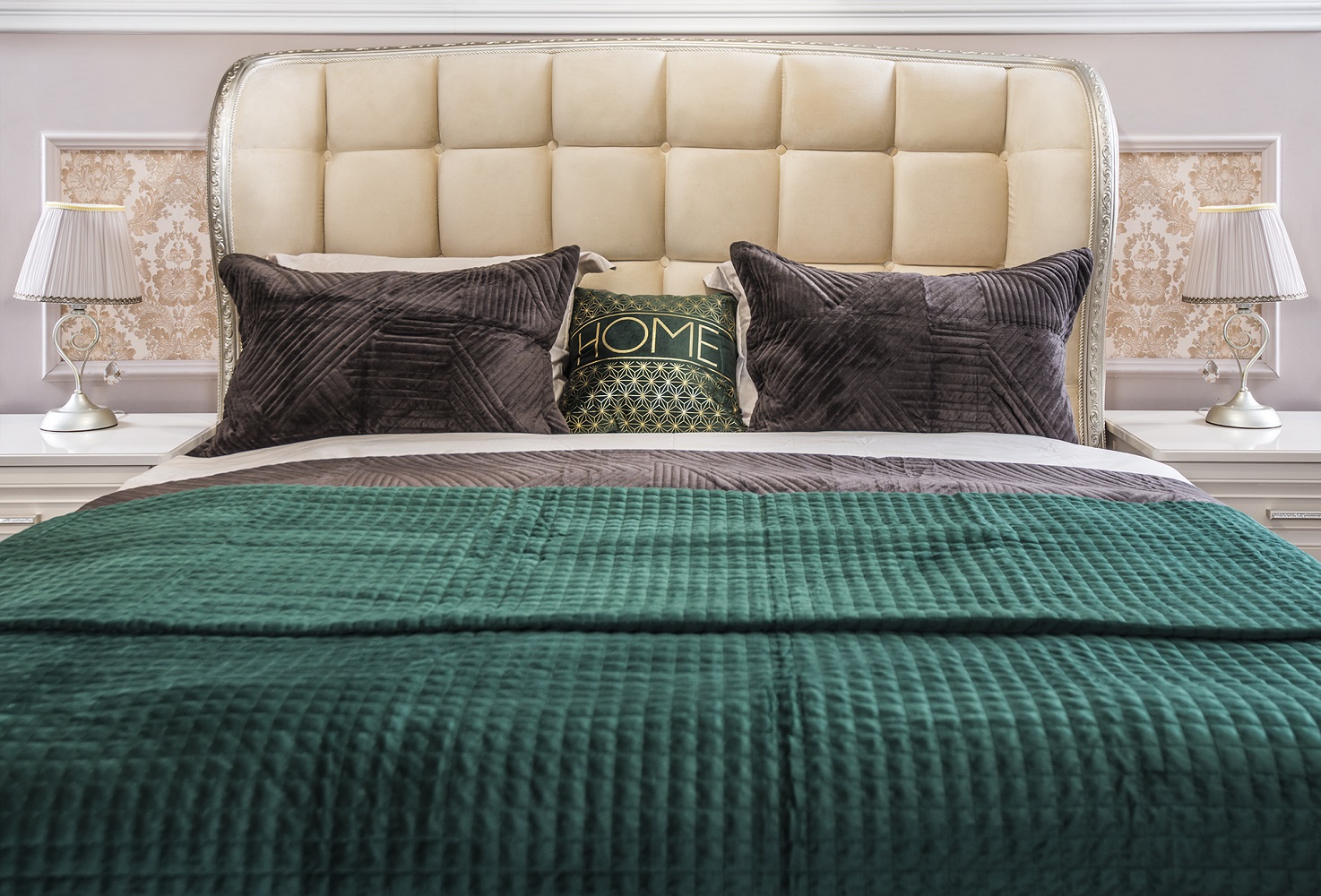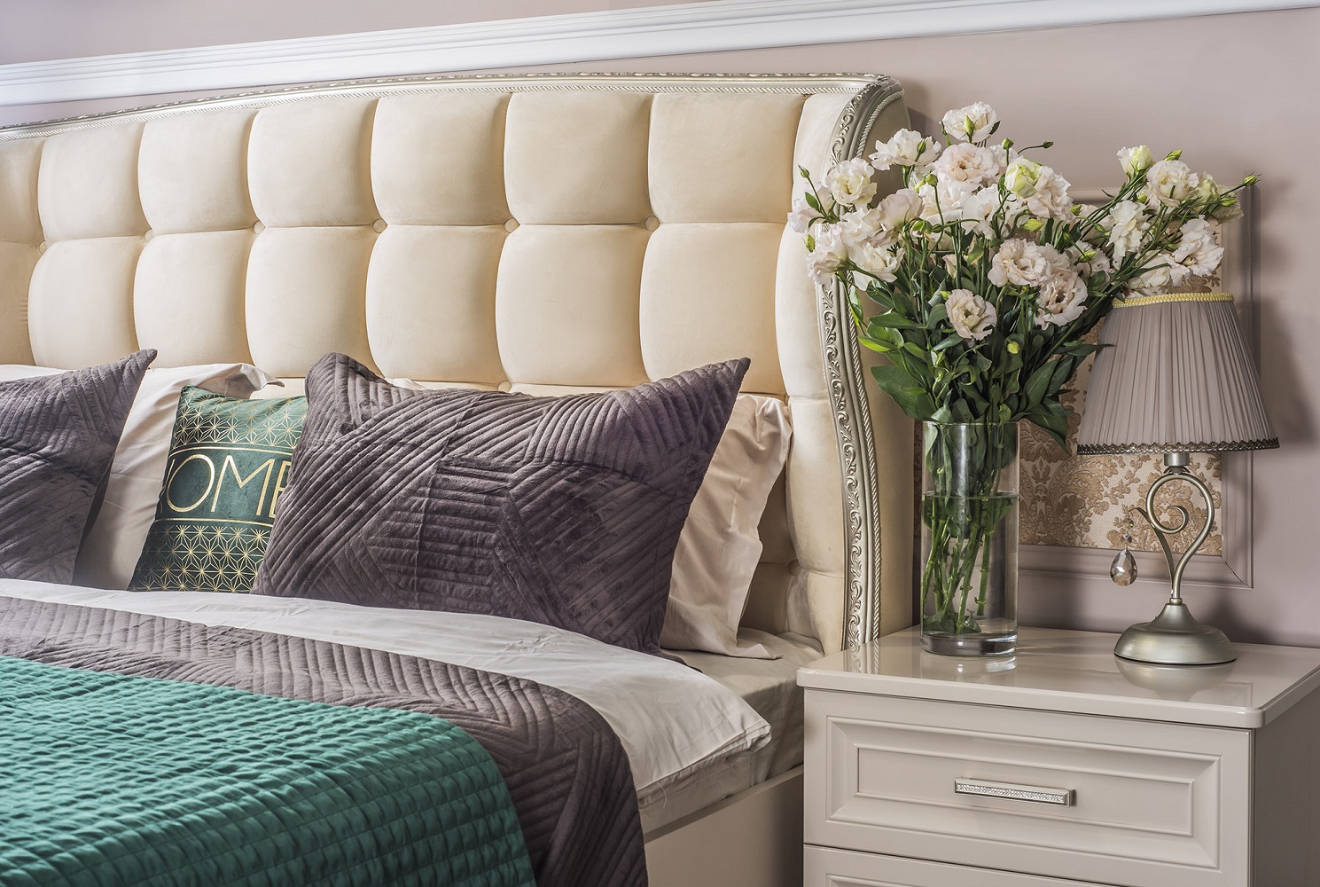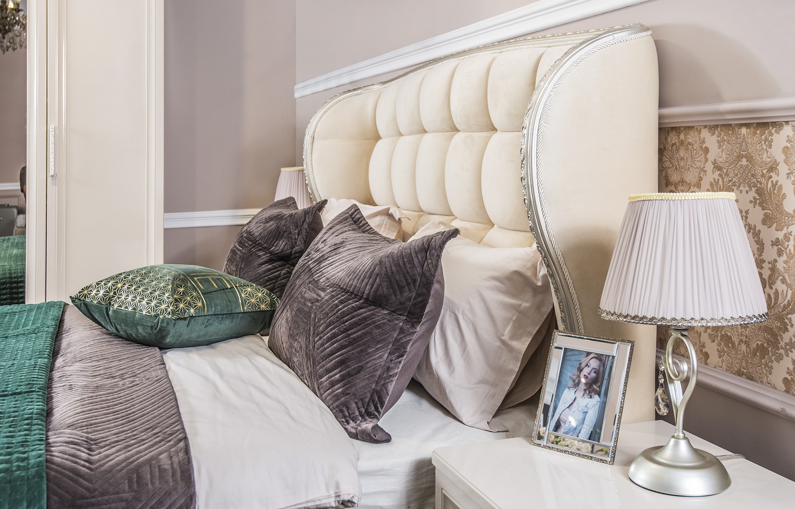 Акцентный элемент в этой спальне интерьерная кровать Нонна. Округлая форма мягкого изголовья выполненного из мягкого велюра будто обнимает своих владельцев, создает неповторимый уют и ощущение тепла и комфорта. Парящий эффект кровати достигается с помощью изящных утончённых ножек-опор что облегчает уборку