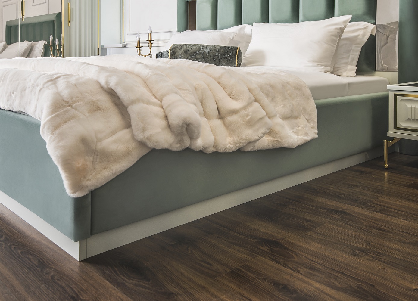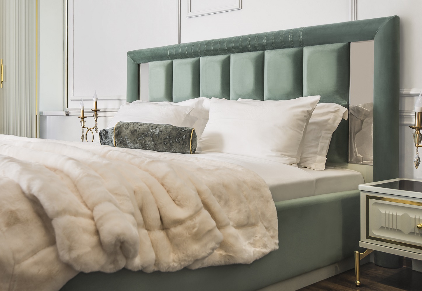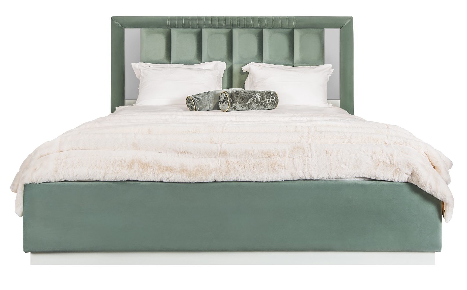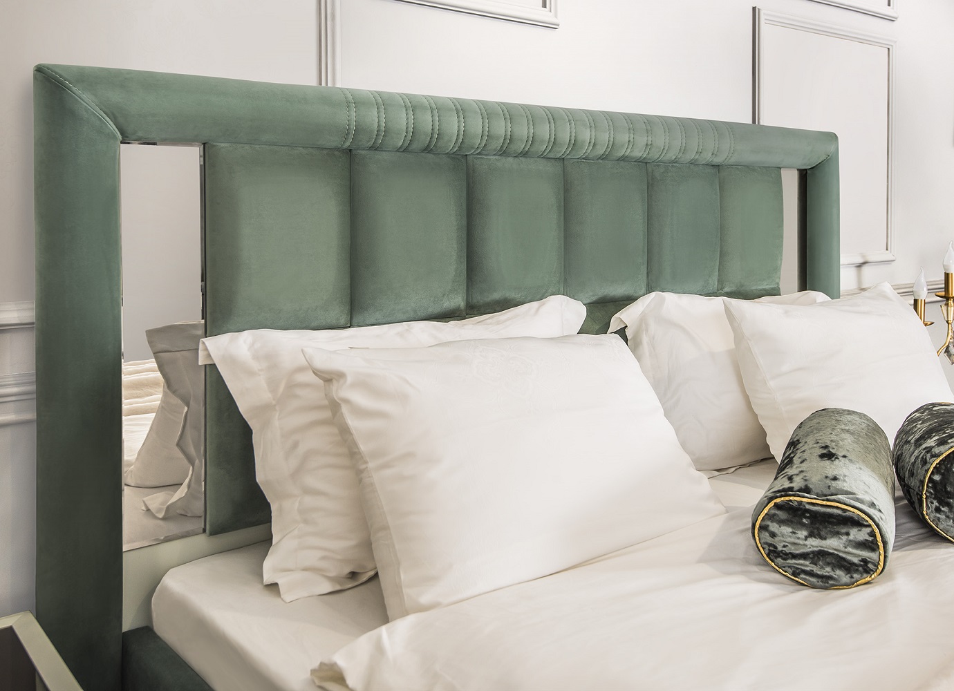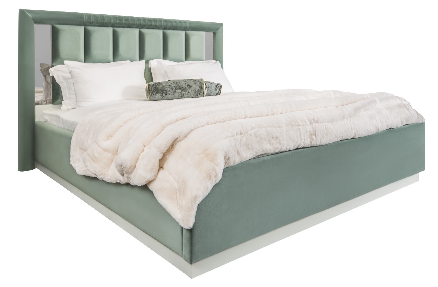 Изголовье: Спинка в велюре, по бокам зеркальные вставки с фацетом, с тыльной стороны кровати (сзади) материал ЛДСП;