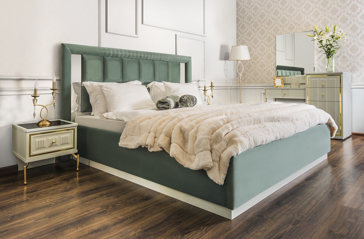 К спальне Замира предлагается мягкий велюровой пуф на латунном цоколе, мягкая мебель — диван и кресло коллекции Lara или Мокко идеально дополнят композицию