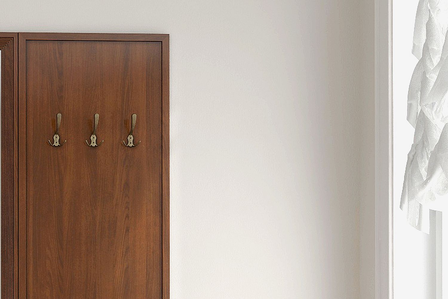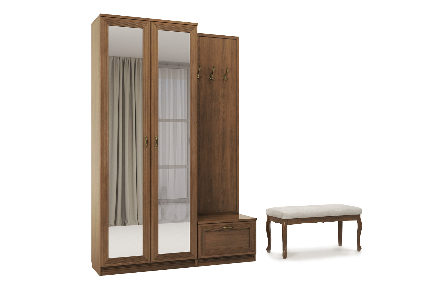 Вместительный шкаф и вешалки позволят разместить верхнюю одежду, тумбочка сохранит в чистоте обувь и аксессуары.
