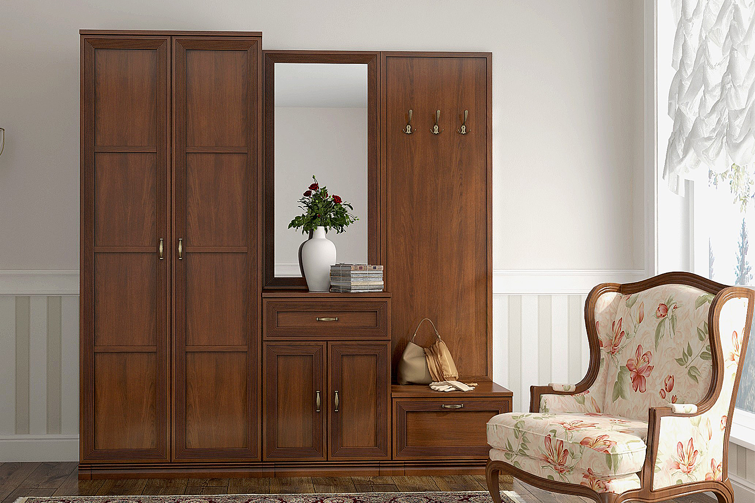 Вместительный шкаф и вешалки позволят разместить верхнюю одежду, а тумбочки сохранят в чистоте обувь и аксессуары.