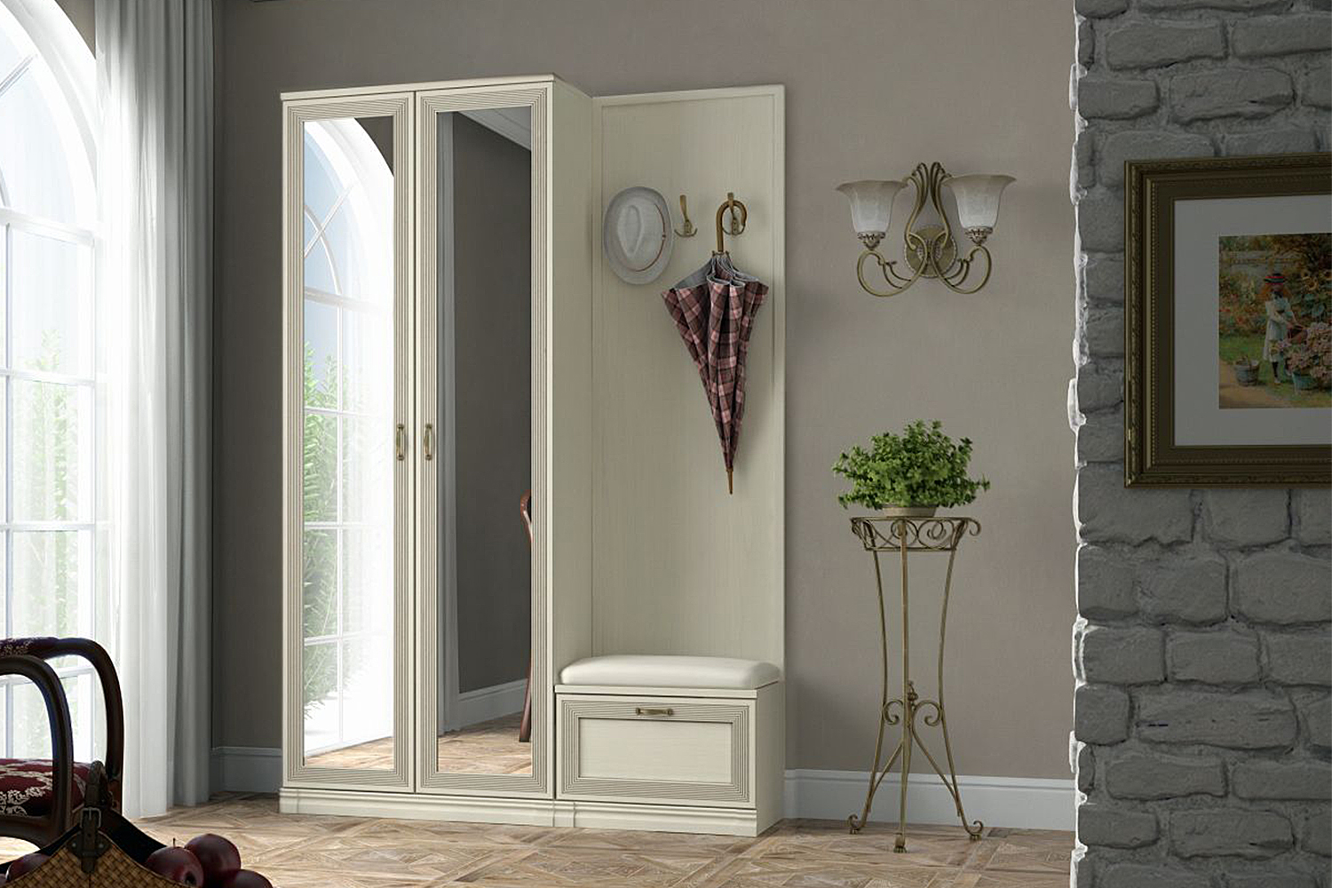 Вместительный шкаф и вешалки позволят разместить верхнюю одежду, а тумбочка сохранит в чистоте обувь и аксессуары.