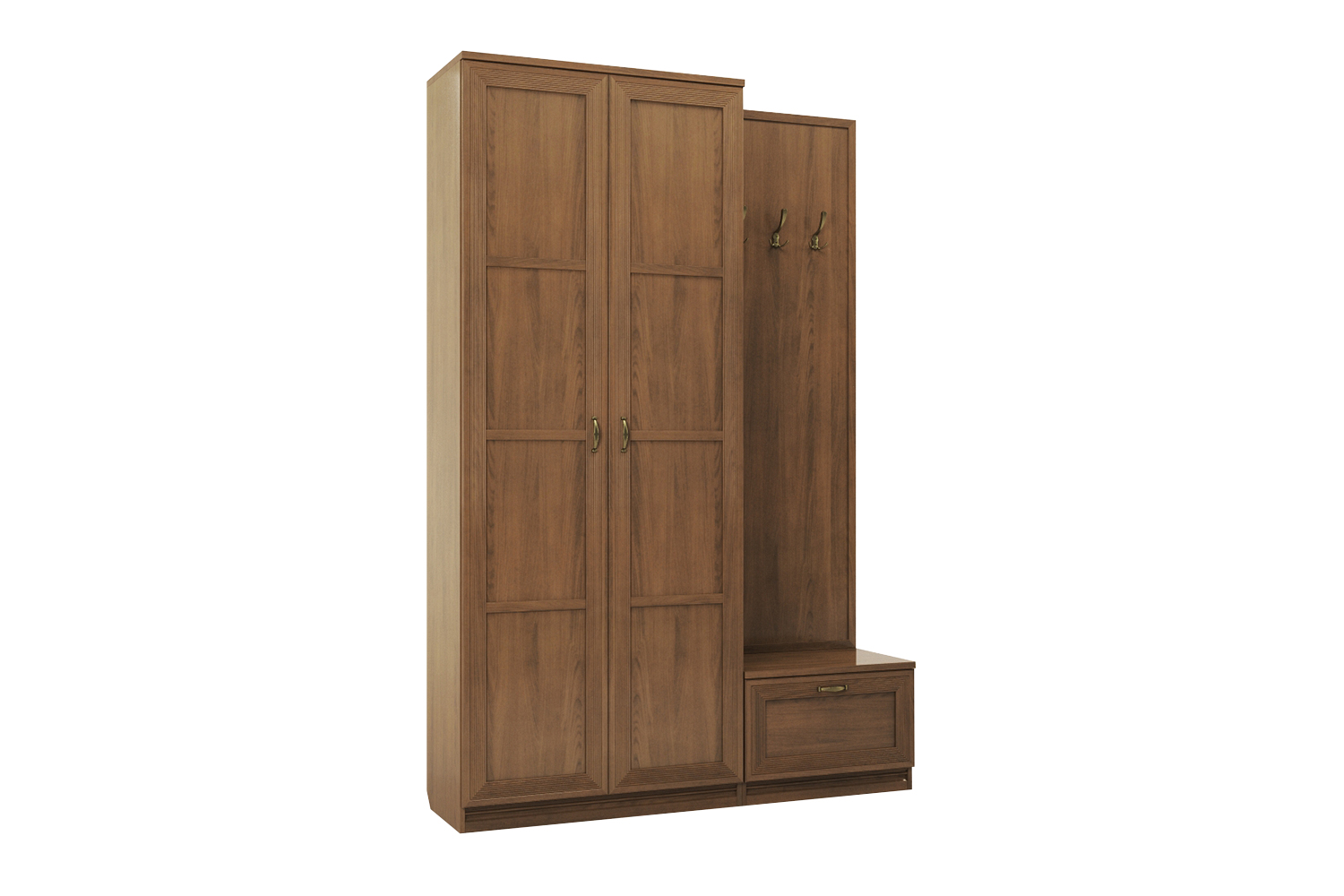 Вместительный шкаф и вешалки позволят разместить верхнюю одежду, а тумбочка сохранит в чистоте обувь и аксессуары.