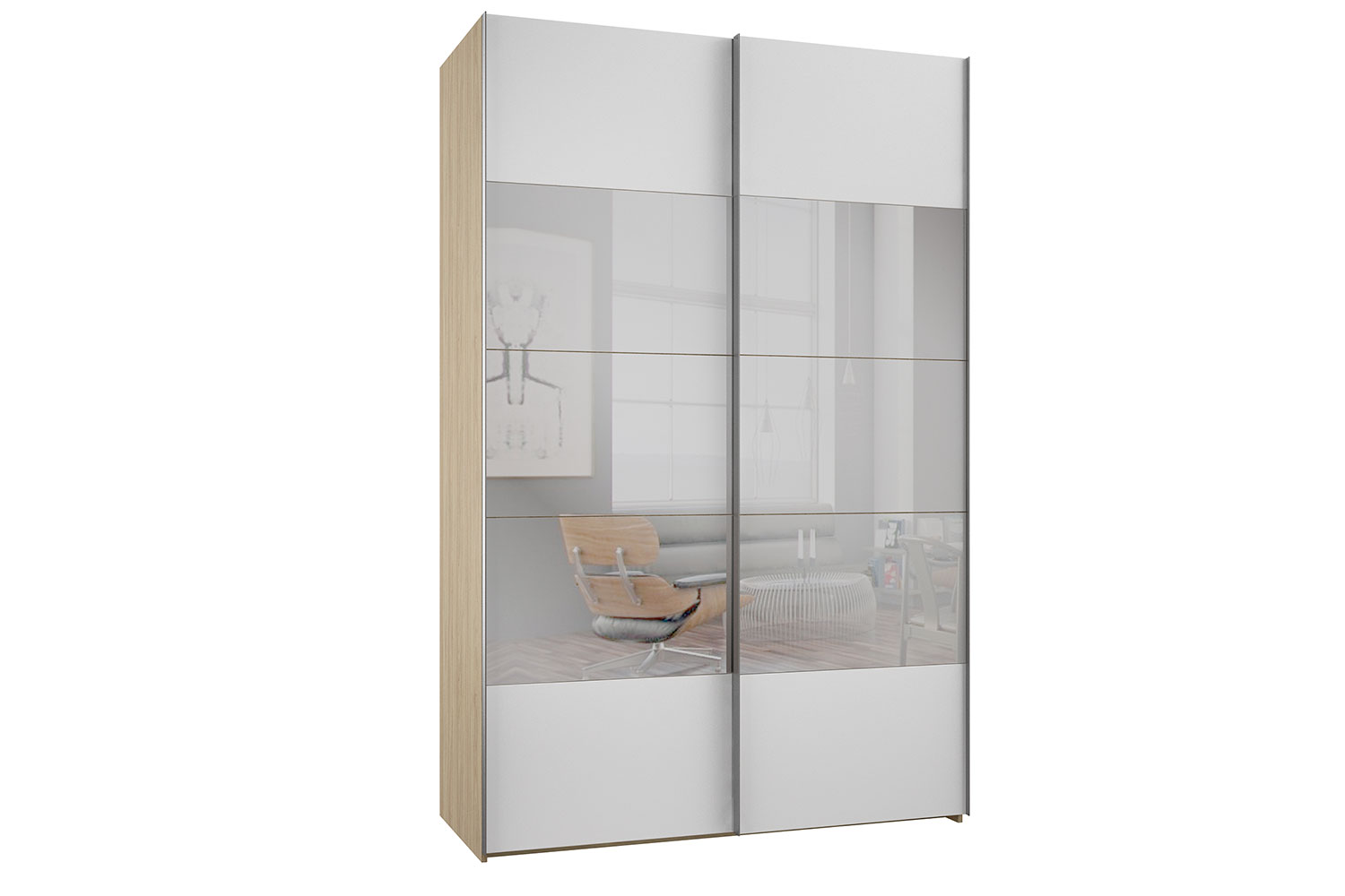 Фасады состоят из 5 частей: верхняя и нижняя часть — из МДФ в пленке ПВХ, средние части — из ЛДСП 1,6 см с наклеенным зеркалом;