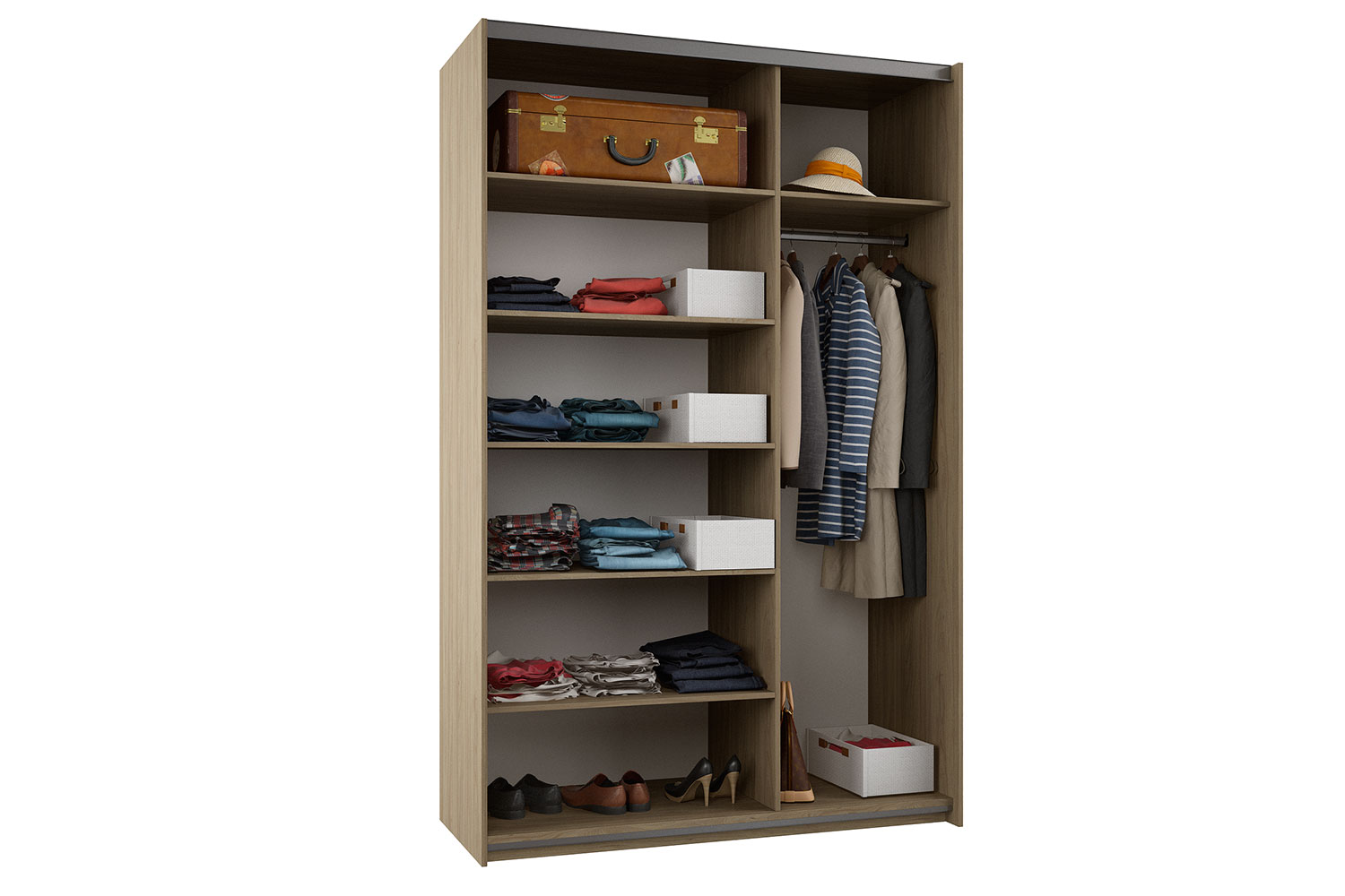 Особенности: двухдорожечная система для раздвижных дверей, накладная навеска дверей, ходовой профиль перед верхней панелью, передняя дверь справа, открывание с ограничением хода, ручки-профили;