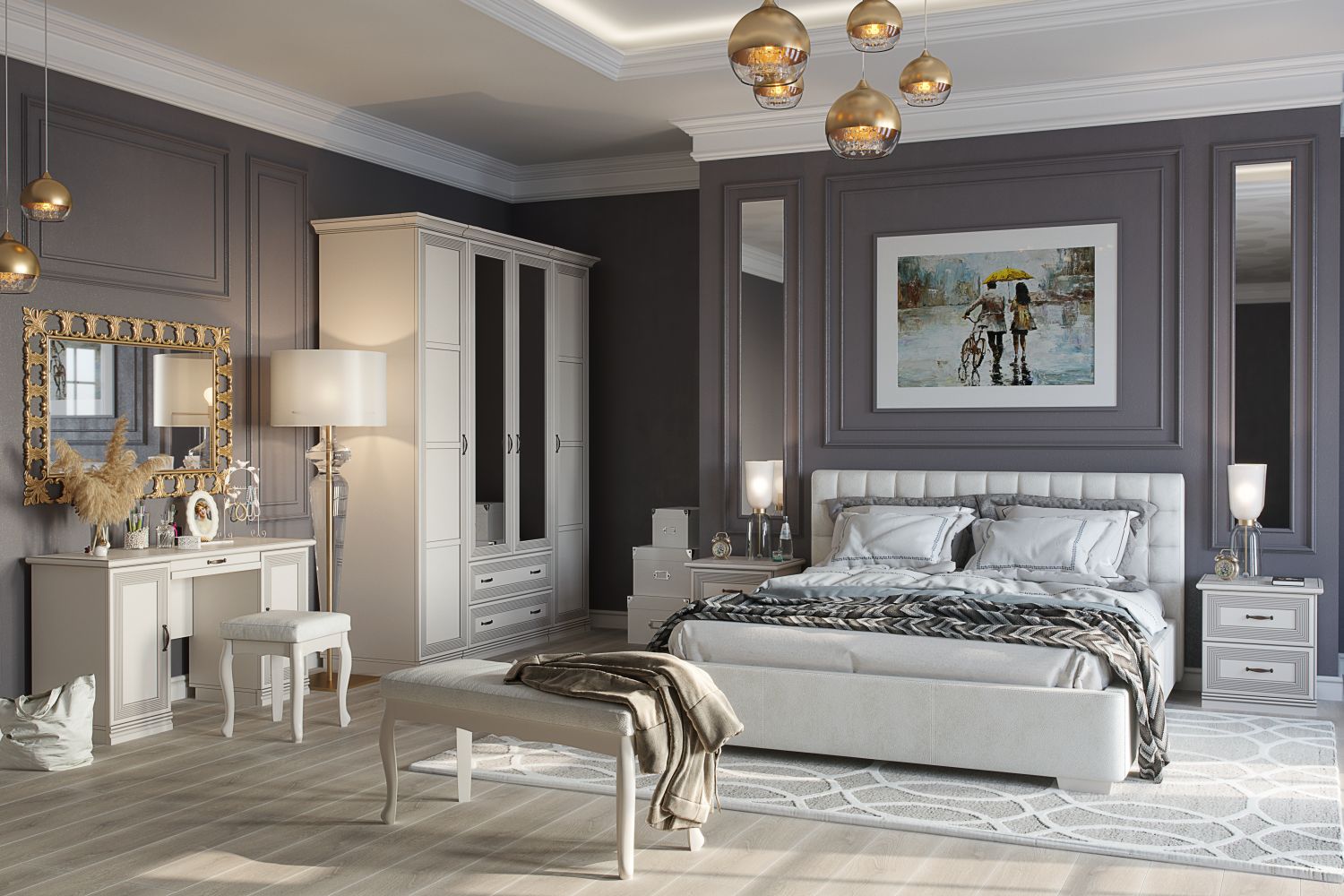 Чтобы сделать интерьер более завершенным, вы можете дополнительно приобрести металлические аксессуары в бронзовых оттенках и абстрактные постеры с яркими акцентами. Для большего удобства композицию можно завершить мягким пуфом или банкеткой в тон мебели. Не забудьте про туалетный столик, который сделает утренние и вечерние ритуалы еще приятнее.