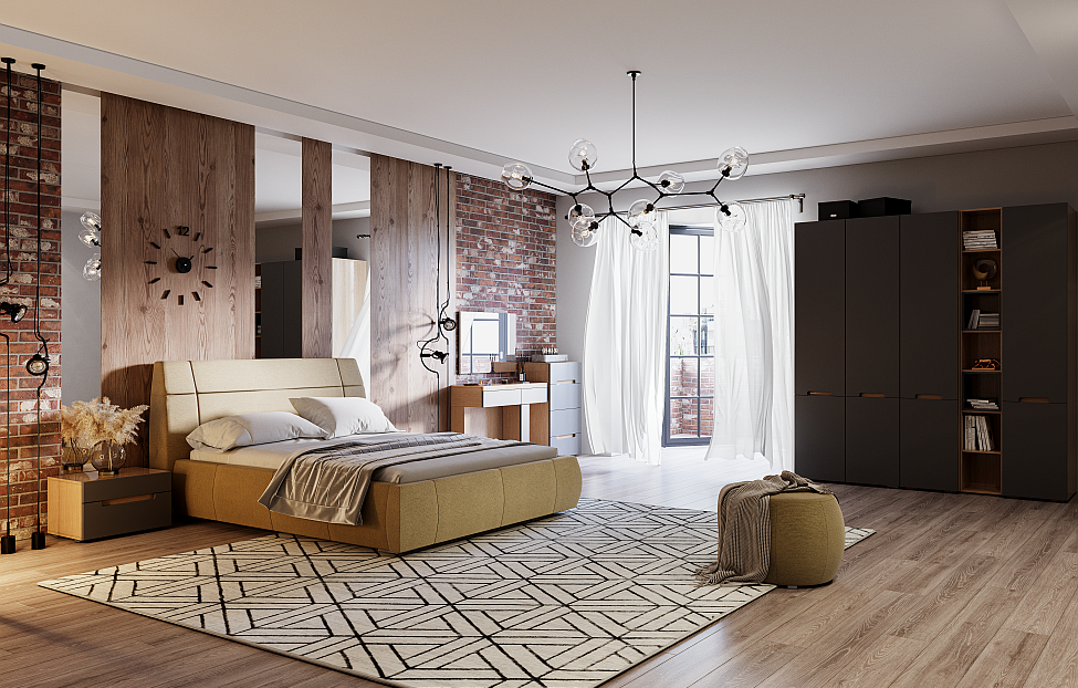 Спальня Анри понравится современным жителям мегаполиса и отлично впишется в холостяцкую квартиру. Но и в доме мебель будет смотреться гармонично, особенно на контрасте с фактурными деревянными стенами.