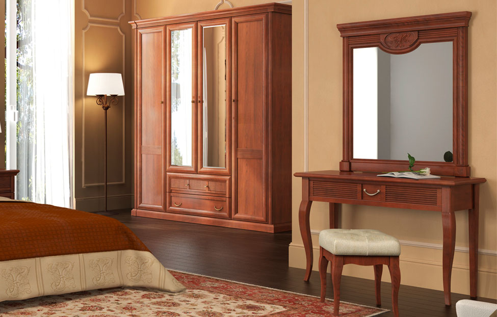 Для хранения в спальне есть комод и четырехстворчатый шкаф, который укомплектован зеркалом. Благодаря этому вы можете увидеть свой образ сразу после переодевания, не выходя в ванную или коридор;