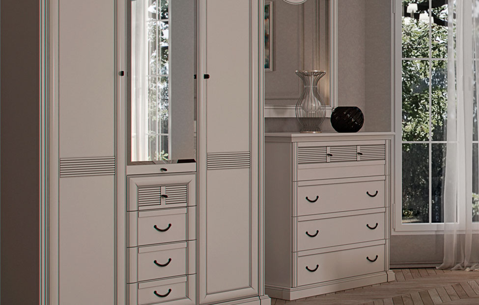 Трехстворчатый шкаф укомплектован зеркалом. Благодаря этому вы можете увидеть свой образ сразу после переодевания, не выходя в ванную или коридор.