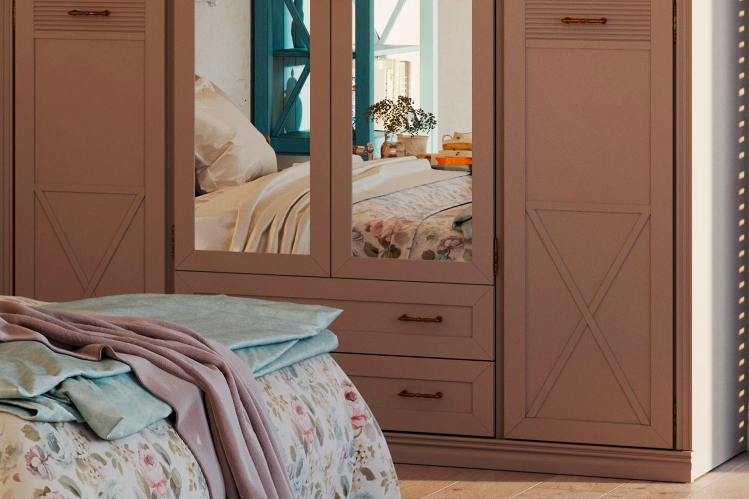 Спальня Кантри 5 На изображении представлен вариант интерьера. Входящие в композицию модули указаны во вкладке «Состав».
