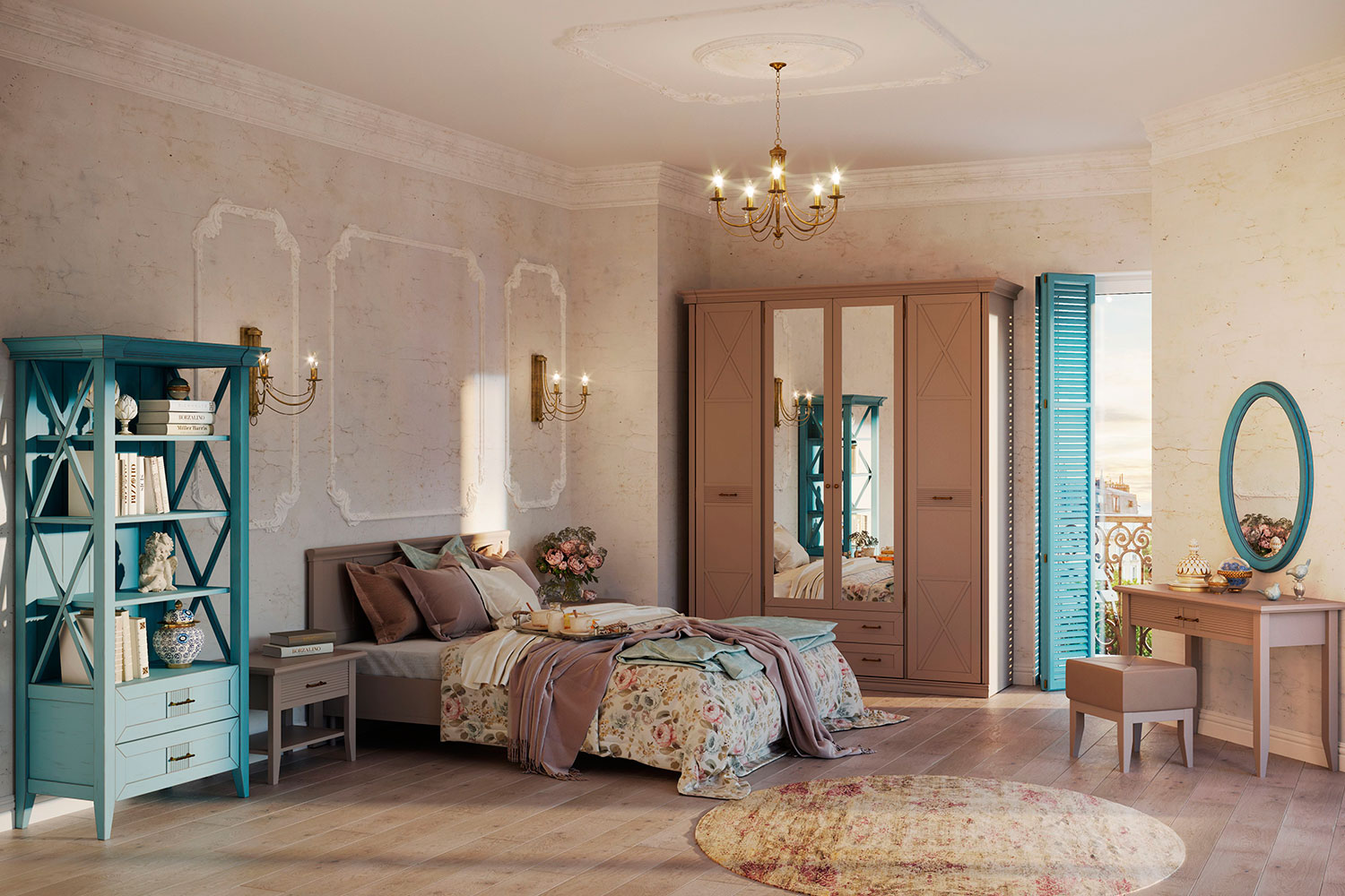 К этой мебели подойдут аксессуары «под винтаж»: клетки для птиц, металлические часы, пледы. Стеллаж или банкетка в стиле прованс контрастных оттенков (например, молочного или бирюзового) создадут дополнительные акценты, а уютный туалетный столик сделает утренние и вечерние ритуалы еще приятнее.